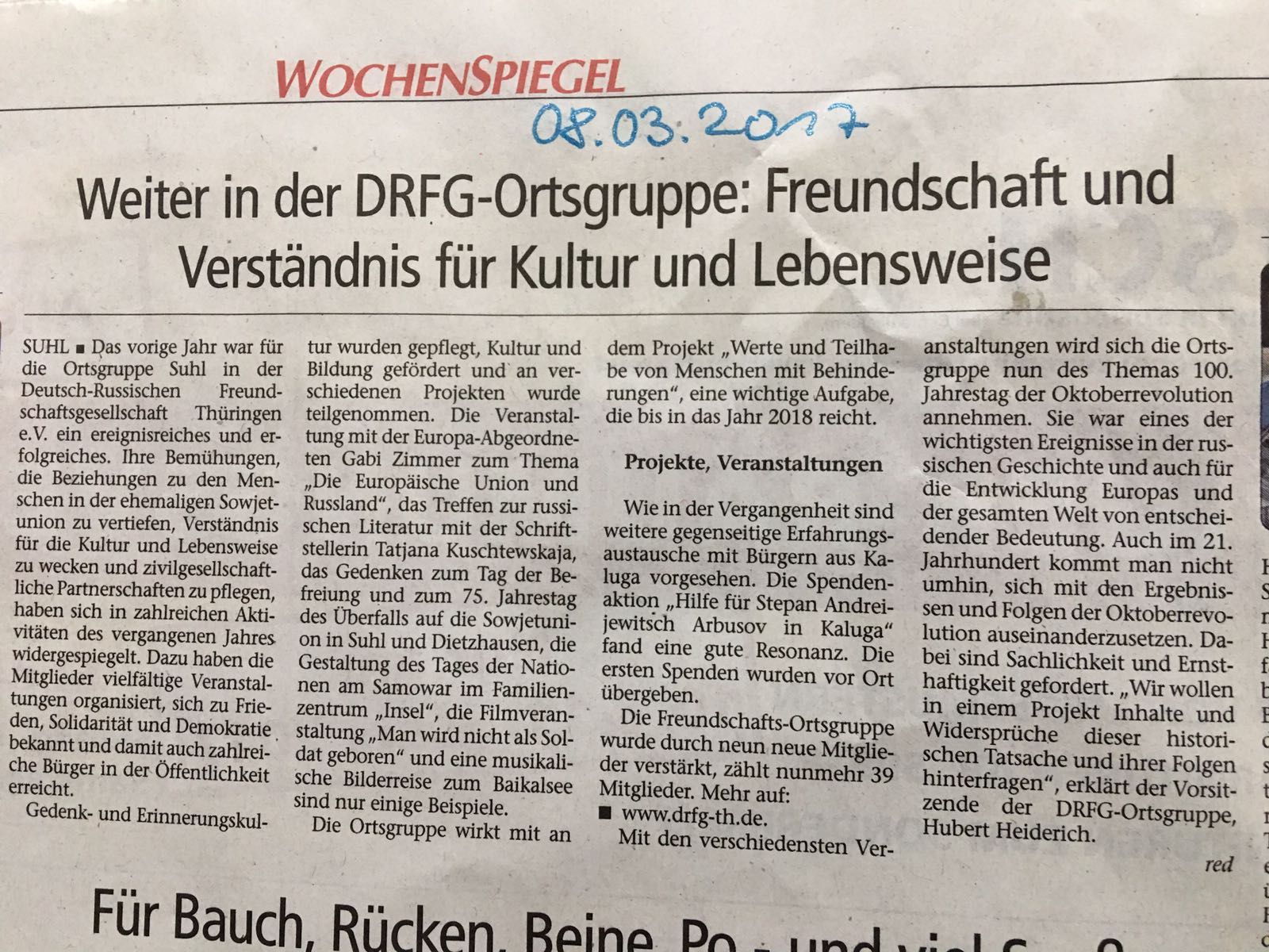 Die Veranstaltung mit der Europa-Abgeordneten und Fraktionsvorsitzenden der Linken im Europaparlament, Gabi Zimmer, zum Thema "Die Europäische Union und Russland ...", die Veranstaltung zur russischen Literatur mit der Schriftstellerin Tatjana Kuschtewskaja in der Stadtbücherei; die Gedenkveranstaltungen zum Tag der Befreiung und zum 75. Jahrestag des Überfalls auf die Sowjetunion in Suhl und Dietzhausen; die Gestaltung des Tages der Nationen am Samowar im Familienzentrum Insel, die Filmveranstaltung "Man wird nicht als Soldat geboren" und eine musikalische Bilderreise zum Baikalsee sind nur einige Beispiele .Im Rahmen der zivilgesellschaftlichen Partnerschaft mit Russland wirkt die Ortsgruppe mit an dem Projekt "Werte und Teilhabe von Menschen mit Behinderungen", eine wichtige Aufgabe, die bis in das Jahr 2018 reicht. Wie in der Vergangenheit sind weitere gegenseitige Erfahrungsaustausche mit Bürgern aus Kaluga vorgesehen. Die Spendenaktion „Hilfe für Stepan Andrejewitsch Arbusov in Kaluga“ fand eine gute Resonanz. Die ersten Spenden wurden vor Ort übergeben.