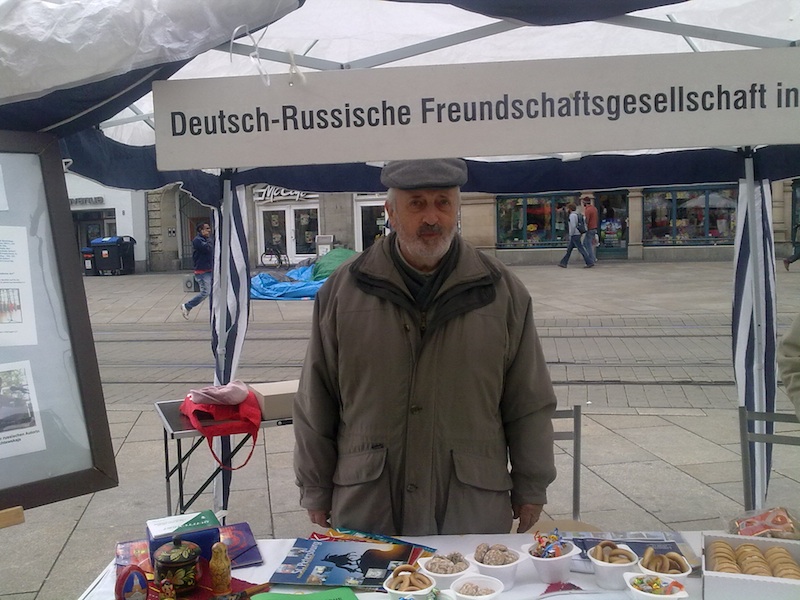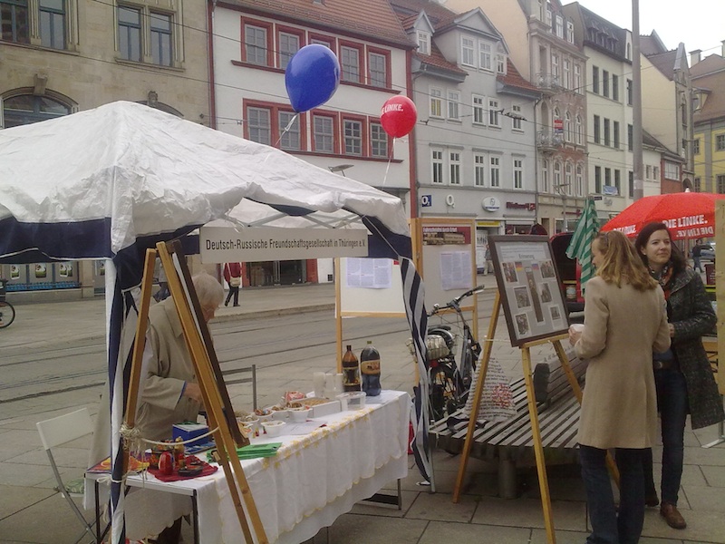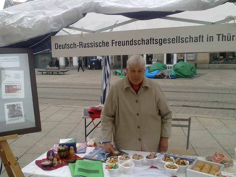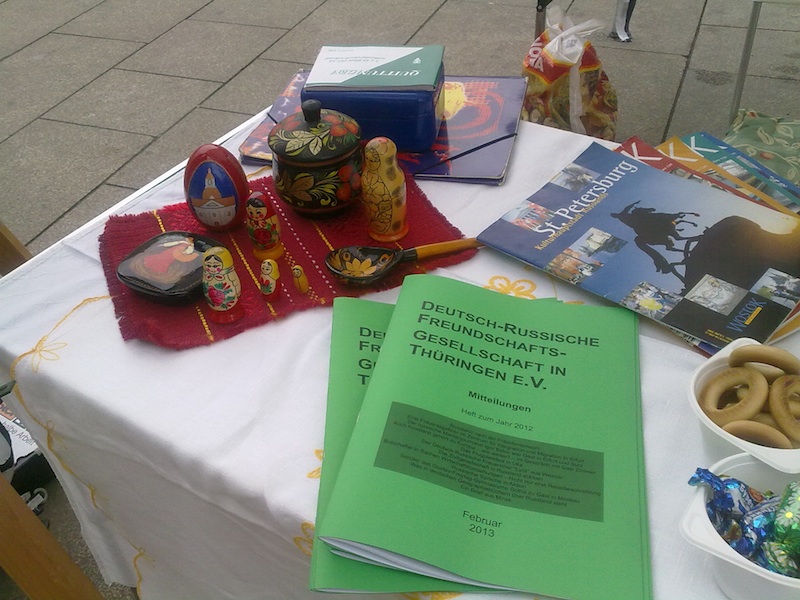Zuerst hiess es den Stand aufbauen und unter tatkräftiger Mithilfe unserer Vorsitzenden Karin Badelt und weiterer Helfer, wie Dr. Duddek, E.Redlich und dem Autor, gelang dies in kürzester Zeit. Durch Schrifttafeln vermittelten wir den zahlreichen Besuchern einen kleinen Einblick in die Arbeit unseres Vereins. Souvenirs aus der Russischen Föderation wie die beliebten Matrjoschka - Puppen erregten immer wieder das Interesse der Besucher. Manchmal fiel auch der Satz: "Ach Euch gibt es ja auch noch, das ist so schlecht nicht."