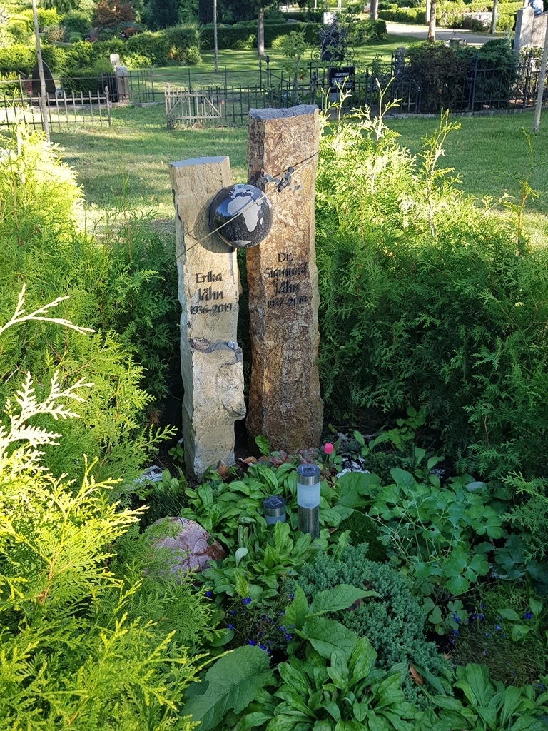 Unser Mitglied Dorothea Feuerbach weilte bei einem Besuch in Straußberg bei Berlin, seiner langjährigen Wahlheimat, auf dem evangelischen St.-Marien-Friedhof und besuchte die Grabstelle. Die Gestaltung des Grabes greift Jähns historische Lebensleistung als Kosmonaut auf. Das Grab wird von zwei unterschiedlich großen Natursteinstelen (Basalt) geprägt. Ein stählerner Meridian schlängelt sich um die Stelen, in dessen Mitte eine gläserne Erdkugel schwebt. Auf dem metallenen Ring, der die Umlaufbahn darstellt, ist ein Modell der sowjetischen Raumstation Saljut 6 zu sehen.