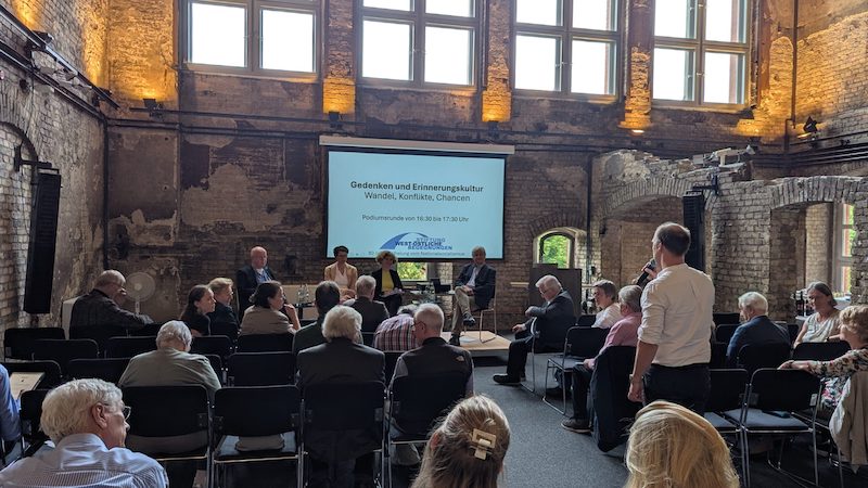 Das zweite Panel widmete sich dem Thema „Gedenken und Erinnerungskultur: Wandel, Konflikte, Chancen“. Es diskutierten Dr. Kristiane Janeke, Zentrum für Militärgeschichte und Sozialwissenschaften der Bundeswehr, Dr. Heike Dörrenbächer, Volksbund Deutsche Kriegsgräberfürsorge e. V., und Martin Bock, Stiftung Erinnerung, Verantwortung und Zukunft, moderiert von Dr. Jörg Morré, Direktor des Museums Berlin-Karlshorst.