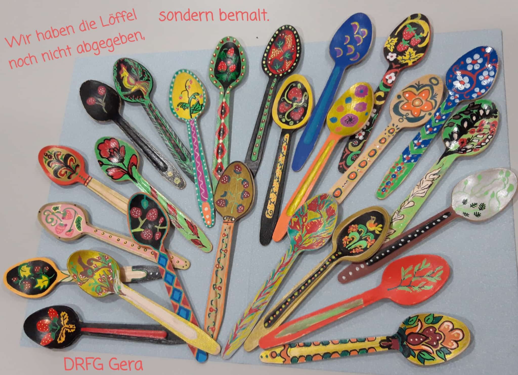 In Vorbereitung dieser Veranstaltung hat Elke Kolodzy zwei Abende lang alle Löffel grundiert, damit die Acrylfarben nicht in den Holzfasern zerlaufen.