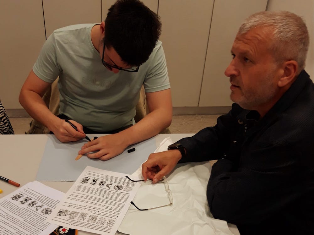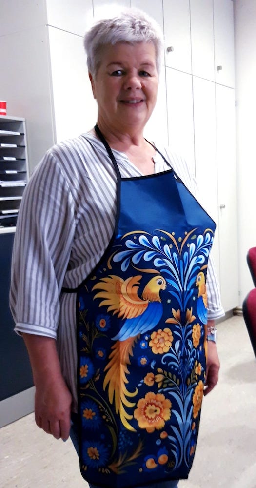 Damit die Motive schnell erkannt und korrekt übertragen werden können, erhielt jeder ein Arbeitsblatt mit einzelnen Beispielen und Hinweisen zu den Farben. Zusätzlich gab es noch zwei kleine Legenden über diese Art der Malerei – Chochloma (russ. Technik) und Pitritivka (ukrainische Technik). Dann ging es forsch an die Arbeit. Jeder hatte Freude, selbst die, die meinten das nicht zu können wurden aktiv und gestalteten ihr Löffel.