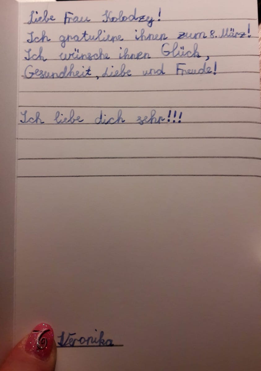 Zum Frauentag erreichte auch Frau Kolodzy ein herzlicher Gruß - eine kleine Gratulation einer ukr. Schülerin (6. Kl.), die bei ihr Deutsch lernt. Der Brief ist so rührend und wir veröffentlichen Ihn auch deshalb, weil bei vielen unserer Jugendlichen dieser Tag so gar nicht mehr wahrgenommen wird. Besonders freut es die Lehrerin, dass das Mädchen ihr so viel Sympathie entgegenbringt.