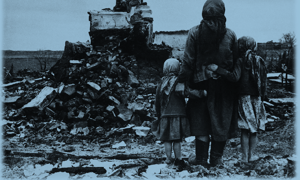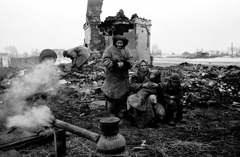 Frauen und Kinder bei den Ruinen der ihnen gehörenden Häuser, zerstört von den deutsch-faschistischen Besatzern, 1943 Belorussische SSR. Photo © Photothek des historischen Instituts des ZK der Belorussischen KP